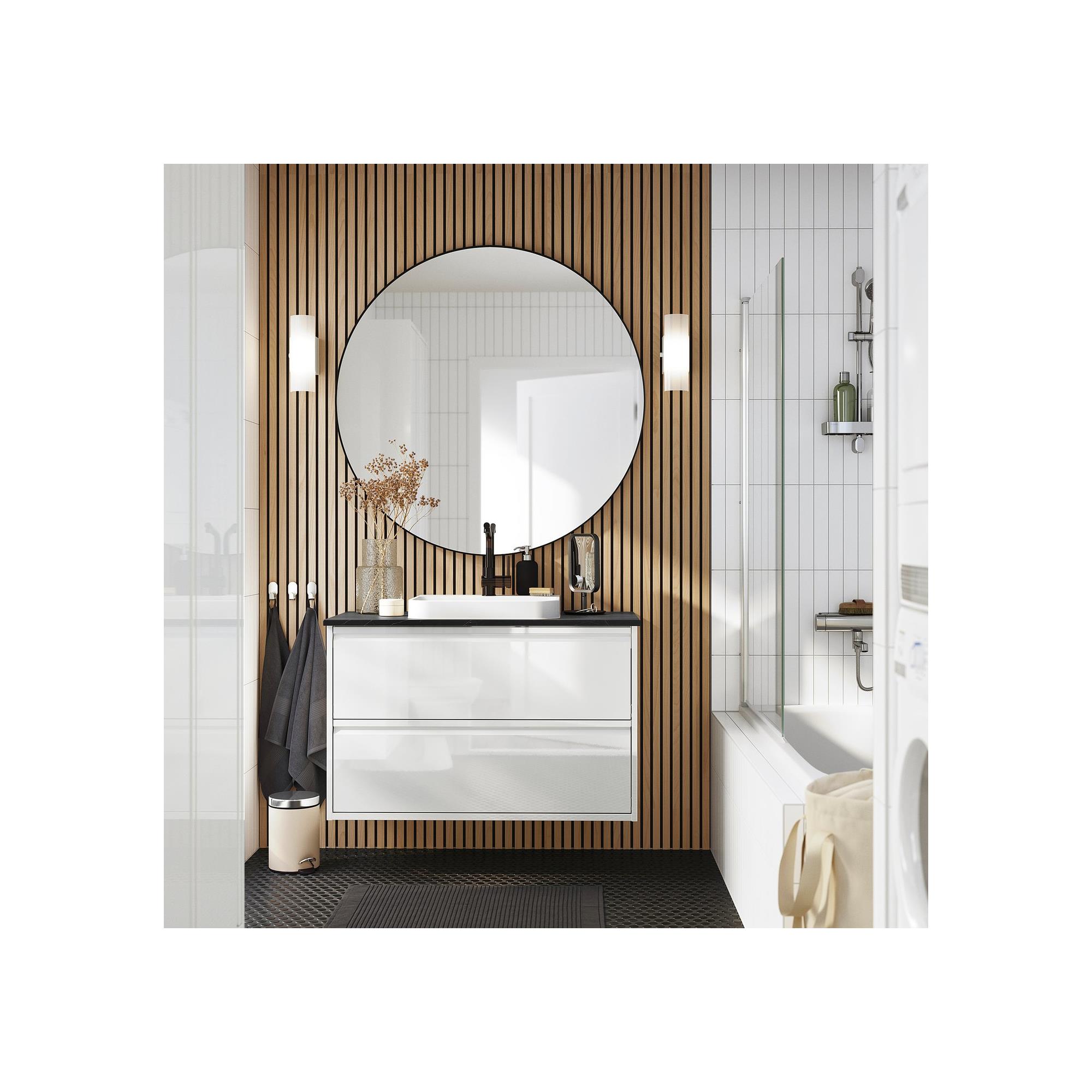 With its minimalistic design ÄNGSJÖN bathroom furniture offers a restful oasis at home where you can unwind and feel the calm settle. The wall-mounted series has clean lines, smooth surfaces and well-thought-out storage that can swallow everything you need in the bathroom. How about a bathroom in high-gloss white or in warm oak? Depending on what you choose, you can stretch and pull the minimalistic design in a direction that feels right for you.