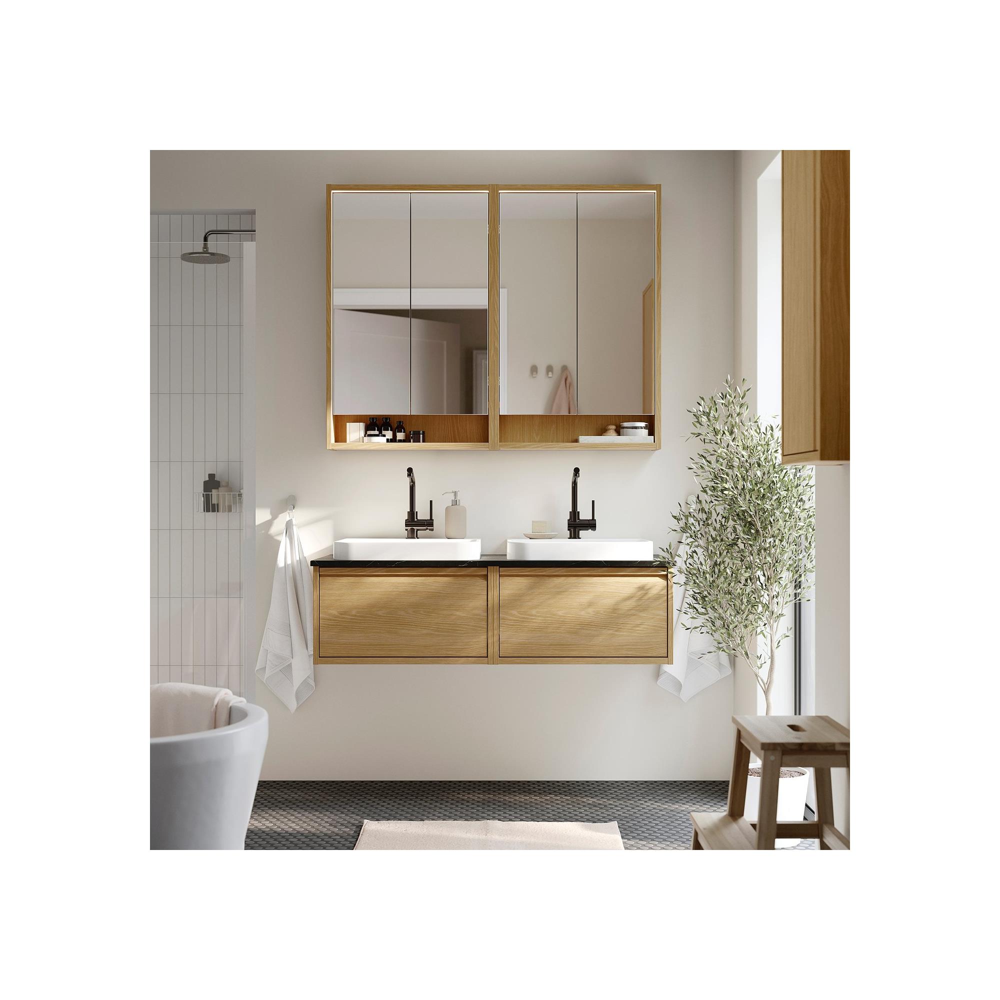 ÄNGSJÖN/TOLKEN/BACKSJÖN wash-basin and cabinet , oak effect-black marble effect, 122x49x41 cm, LUNDSKAR tap