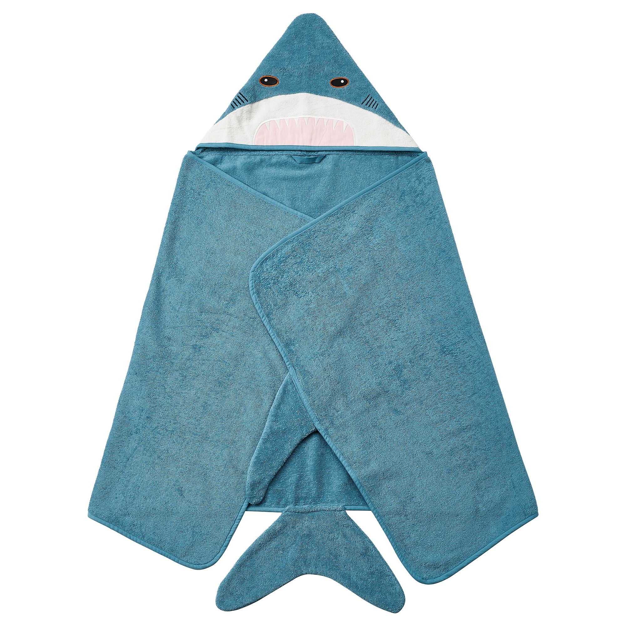 This large towel with a hood can transform your newly bathed child into a live blue shark with both back and tail fins. Woven from warming cotton terry that feels soft against the skin.