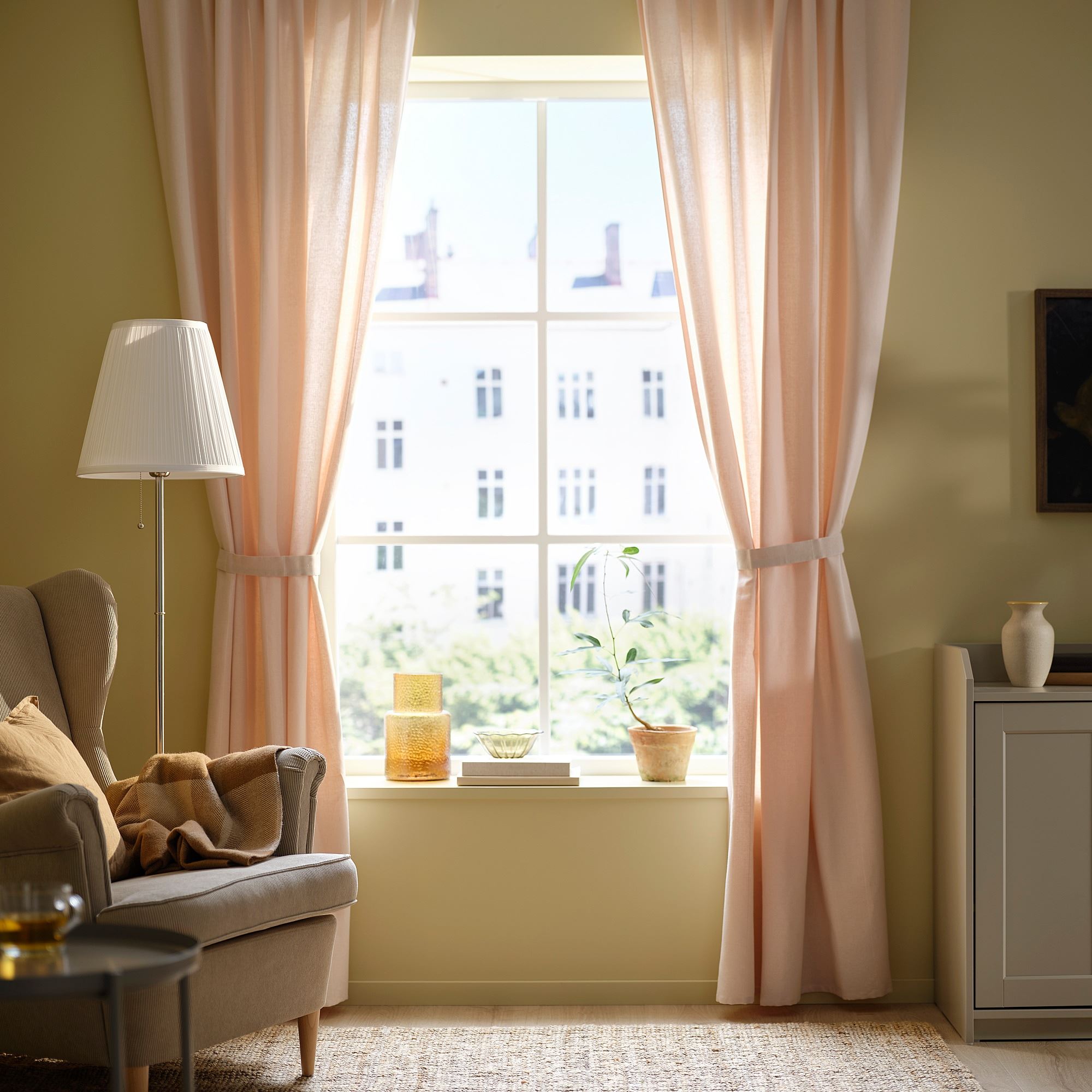 LENDA curtains in light pink cotton with header tape have a ribbed texture that adds character. Ideal for living rooms or bedrooms and also in layered solutions. The tiebacks add a decorative flair.