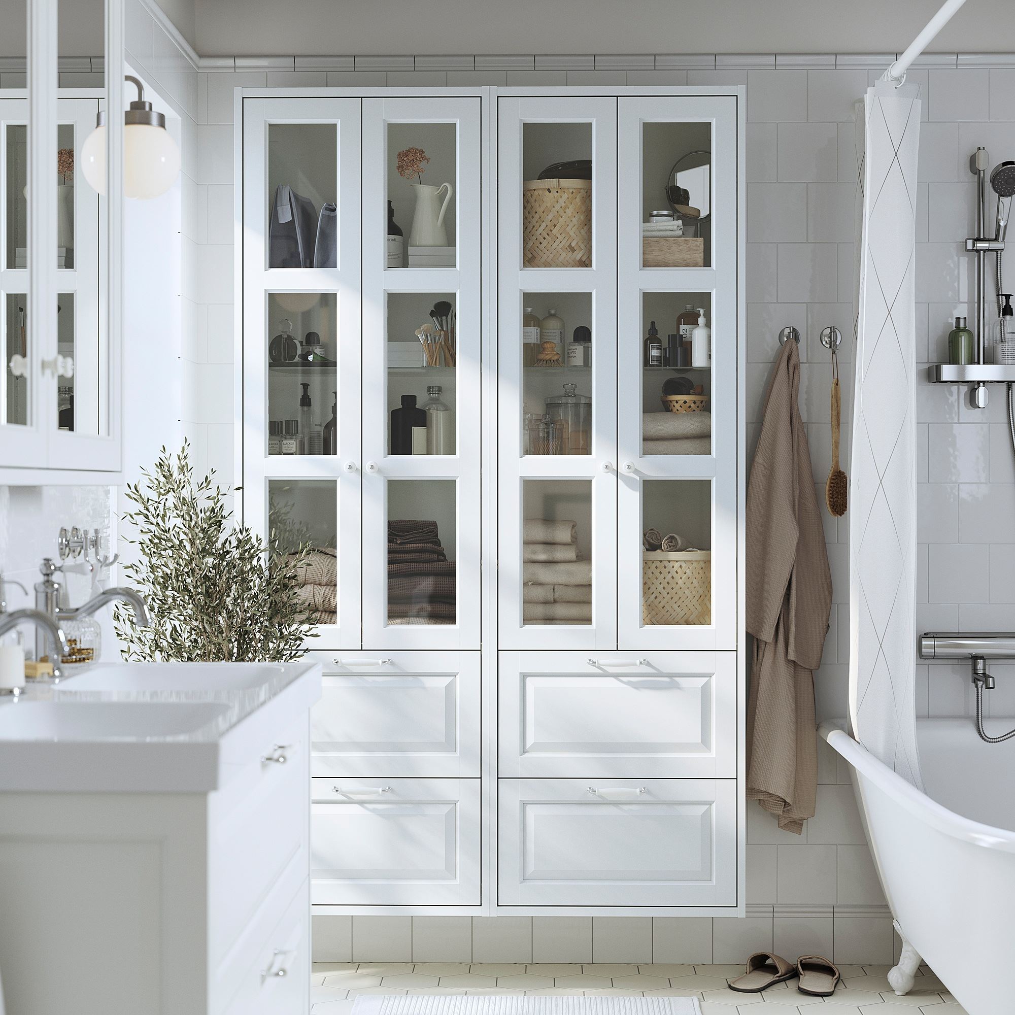 Classic details like bevelled panels make TÄNNFORSEN bathroom series a statement of your unique style. This high cabinet with drawers and glass doors provides roomy storage on little floor space.
