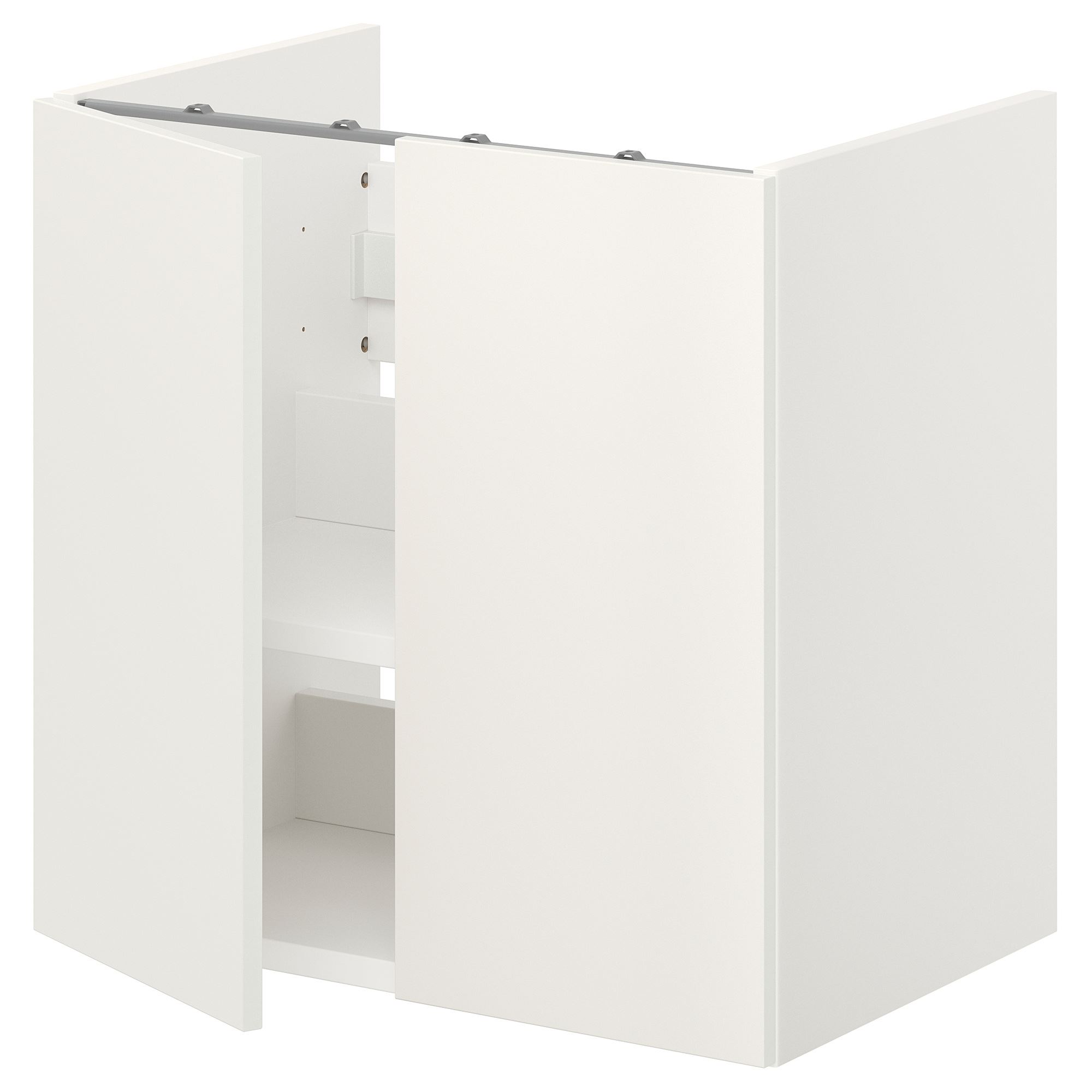ENHET serisi, yeni banyo çözümü ile taze bir başlangıç yapmayı kolaylaştırıyor. Bu raflı lavabo alt dolabı ile havluları ve tuvalet kağılarını elinizin altında tutabilirsiniz. Beyaz kapaklar odayı aydınlatır.