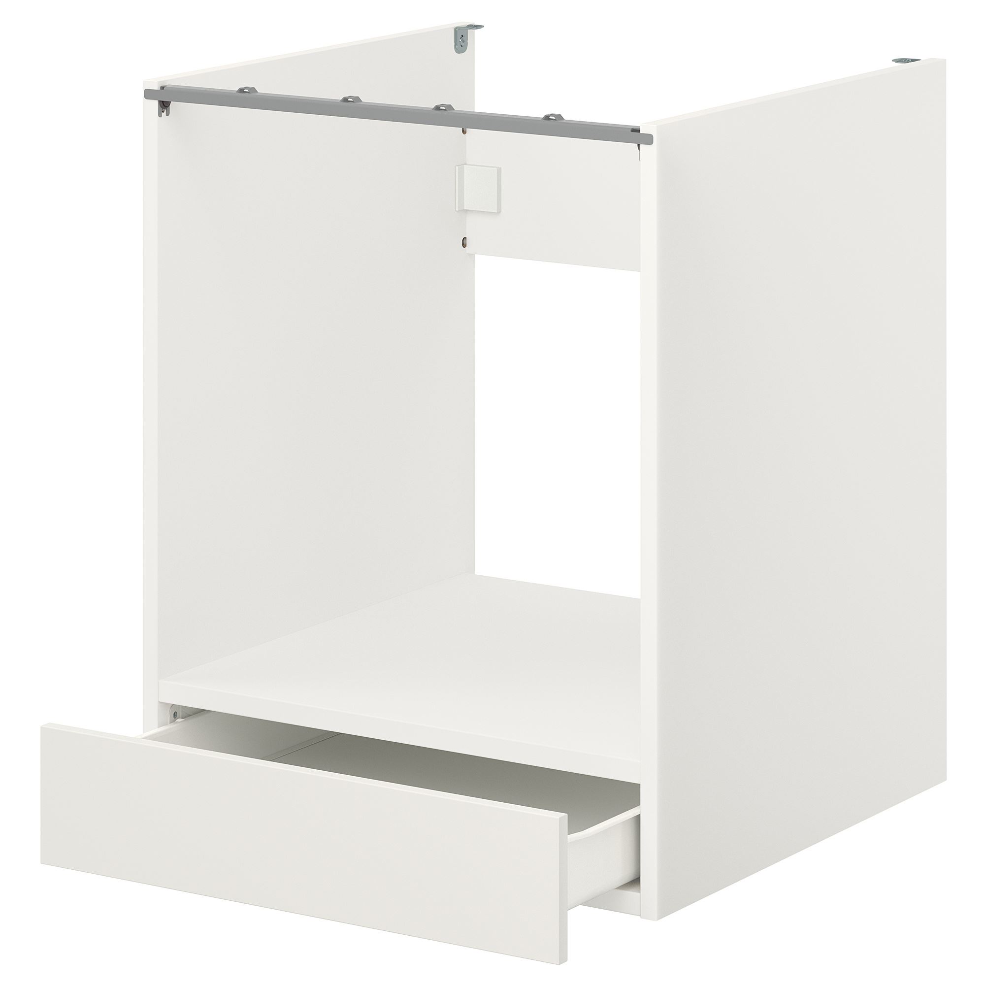 ENHET serisi, yeni bir mutfak çözümü ile yeni bir başlangıç yapmayı kolaylaştırır. Bu dolap ankastre fırın için tasarlanmıştır. Altında, odayı aydınlatan sade, beyaz ön panelli bir çekmece bulunur.