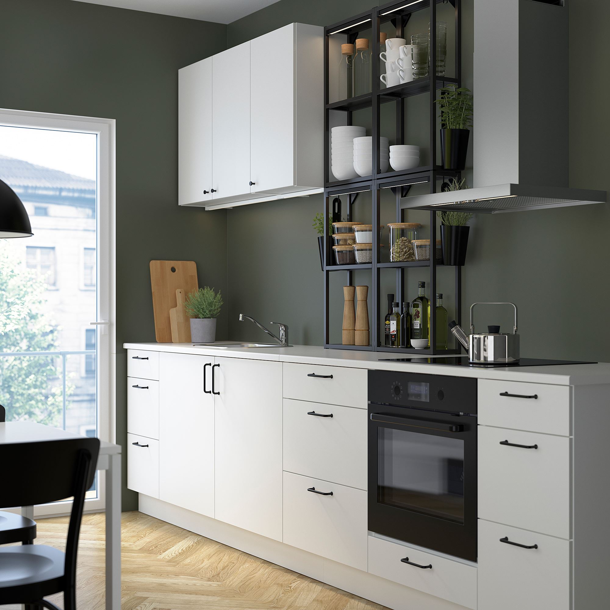 ENHET serisi, yeni bir mutfak çözümü ile yeni bir başlangıç yapmayı kolaylaştırır. Bu kombinasyon, açık ve kapalı depolama, geniş bir çalışma alanı ve hevesli bir şefin ihtiyaç duyduğu tüm işlevlerin kişisel bir karışımını sunar.