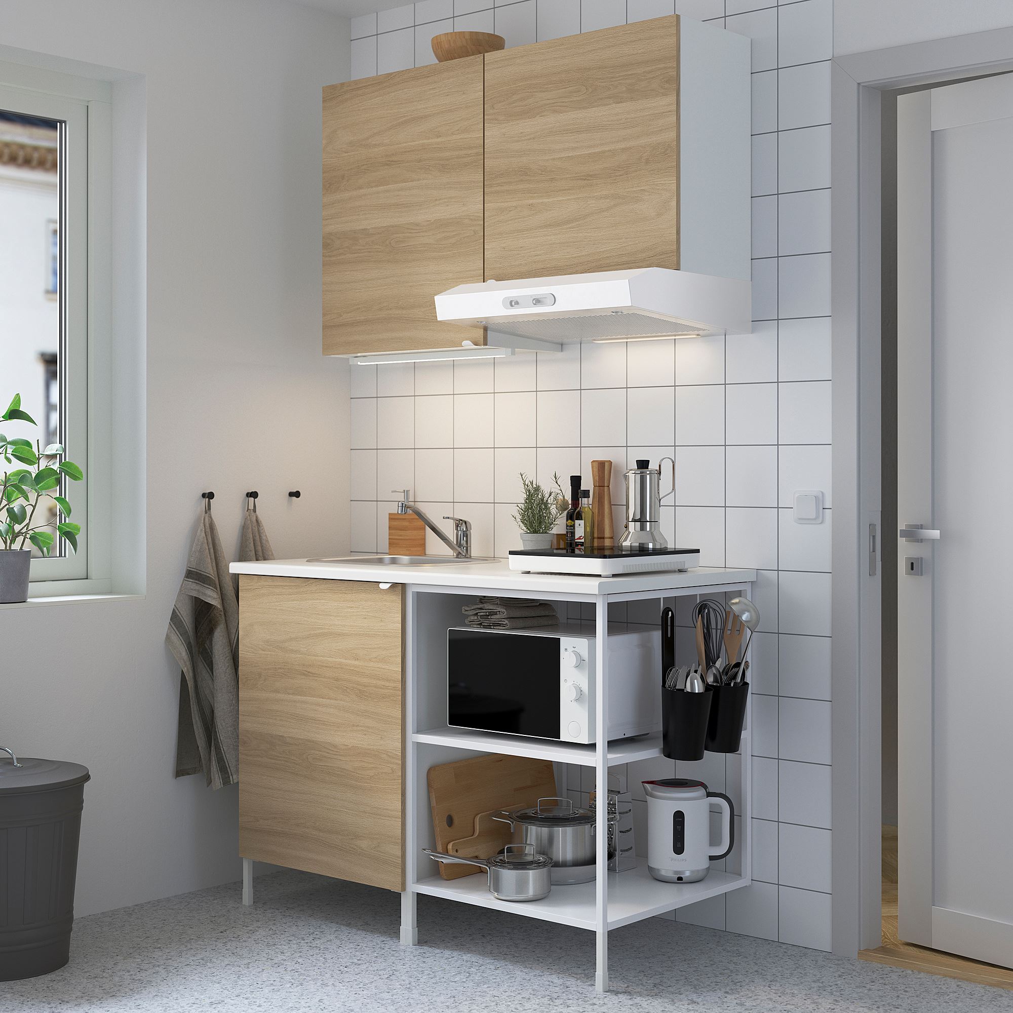 ENHET serisi, yeni bir mutfak çözümü ile yeni bir başlangıç yapmayı kolaylaştırır. Bu kombinasyon, tümü 130 cm'lik bir alanda, açık ve kapalı depolamanın yanı sıra birleşik çalışma ve pişirme alanının mükemmel bir karışımını sunar.