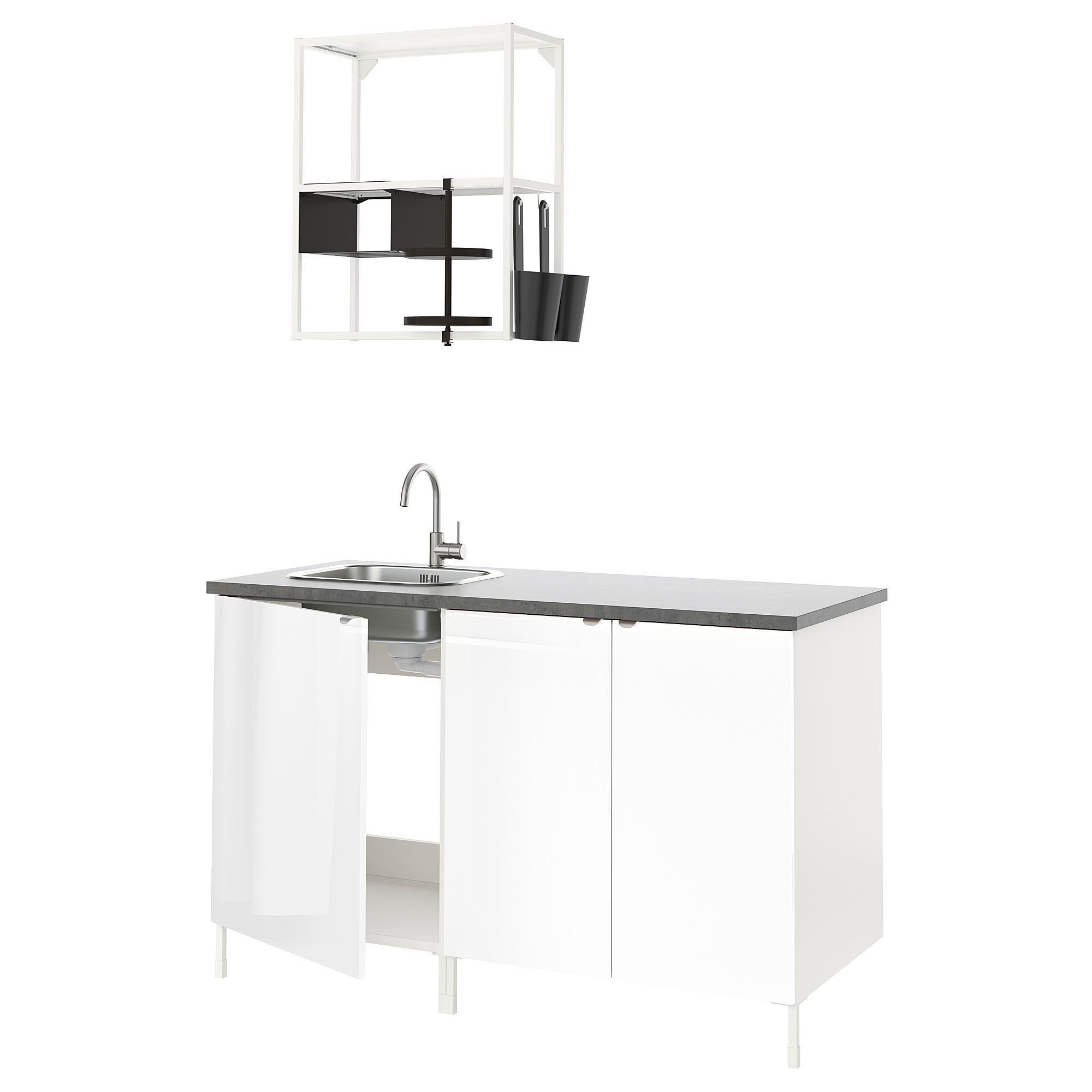 ENHET serisi, yeni bir mutfak veya çamaşır odası çözümü ile yeni bir başlangıç yapmayı kolaylaştırır. Bu kombinasyon sadece 150 cm genişliğindedir ancak açık ve kapalı depolama ile ihtiyacınız olan tüm fonksiyonların mükemmel bir karışımını sunar.
