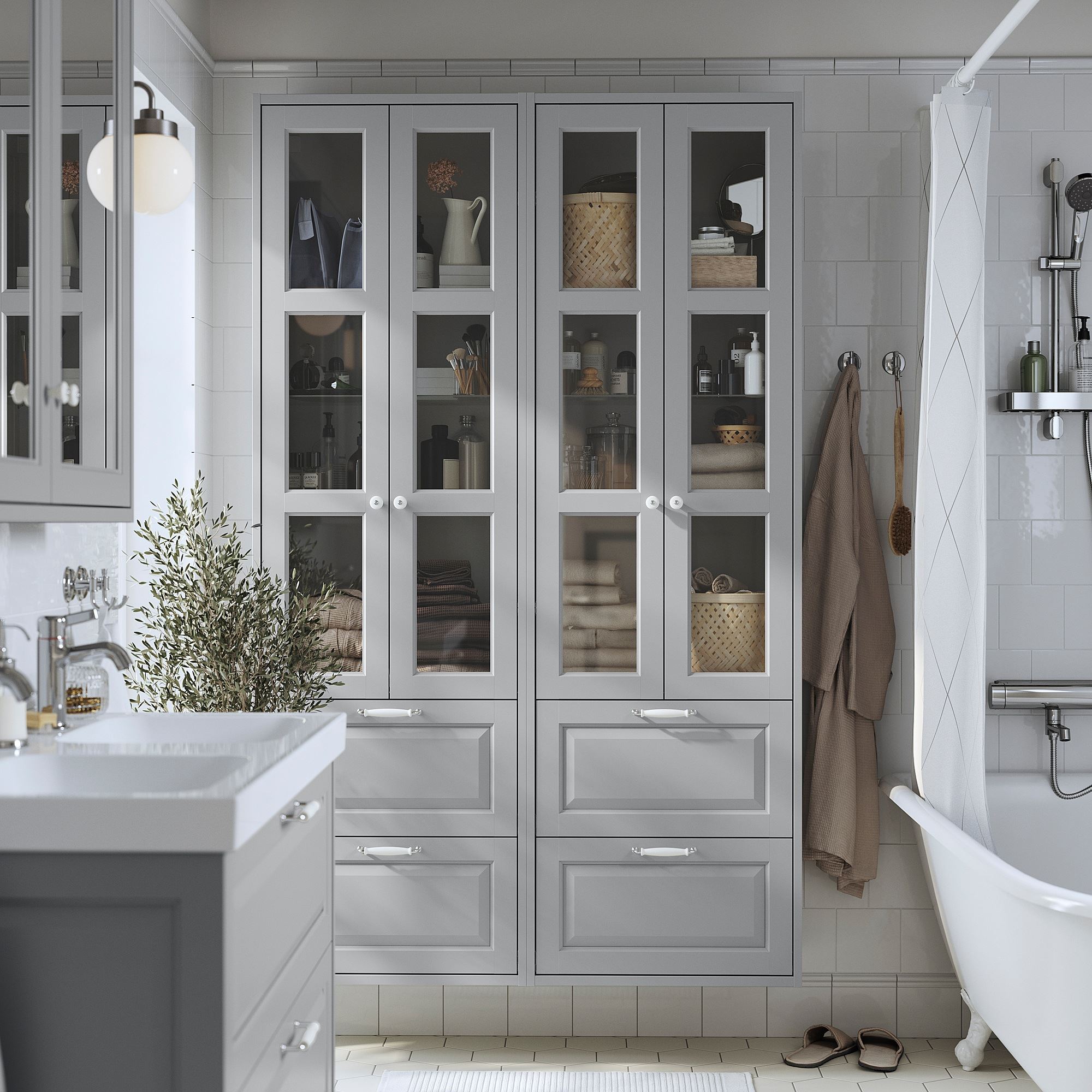 Eğimli paneller gibi klasik detaylar, TÄNNFORSEN banyo serisini benzersiz tarzınızın bir ifadesi haline getirir. Çekmeceli ve cam kapaklı bu yüksek dolap, az yer kaplayan geniş bir depolama alanı sağlar.
